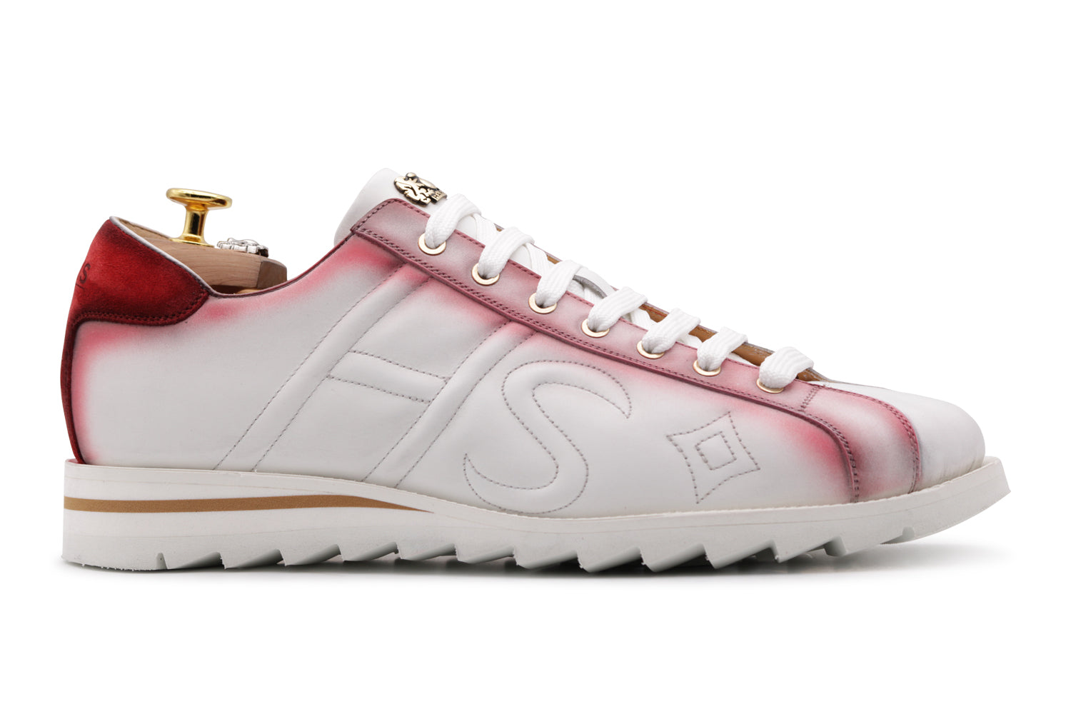 Piel de becerro de plena flor pintada a mano con artesanía experta, completada con detalles oscuros en contraste. Una zapatilla versátil y de calidad.