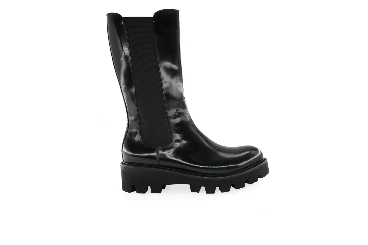 Anfibio antiguo en cuero antiguo, color negro. Un modelo apretado caracterizado por la parte superior superior con costuras en el talón y el cuello. Suela de goma alta. Hecho en Italia.