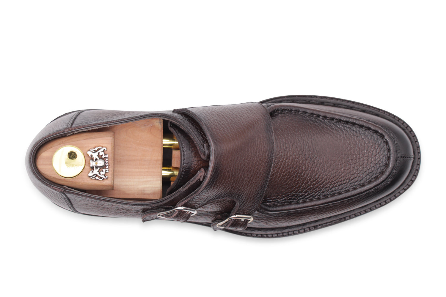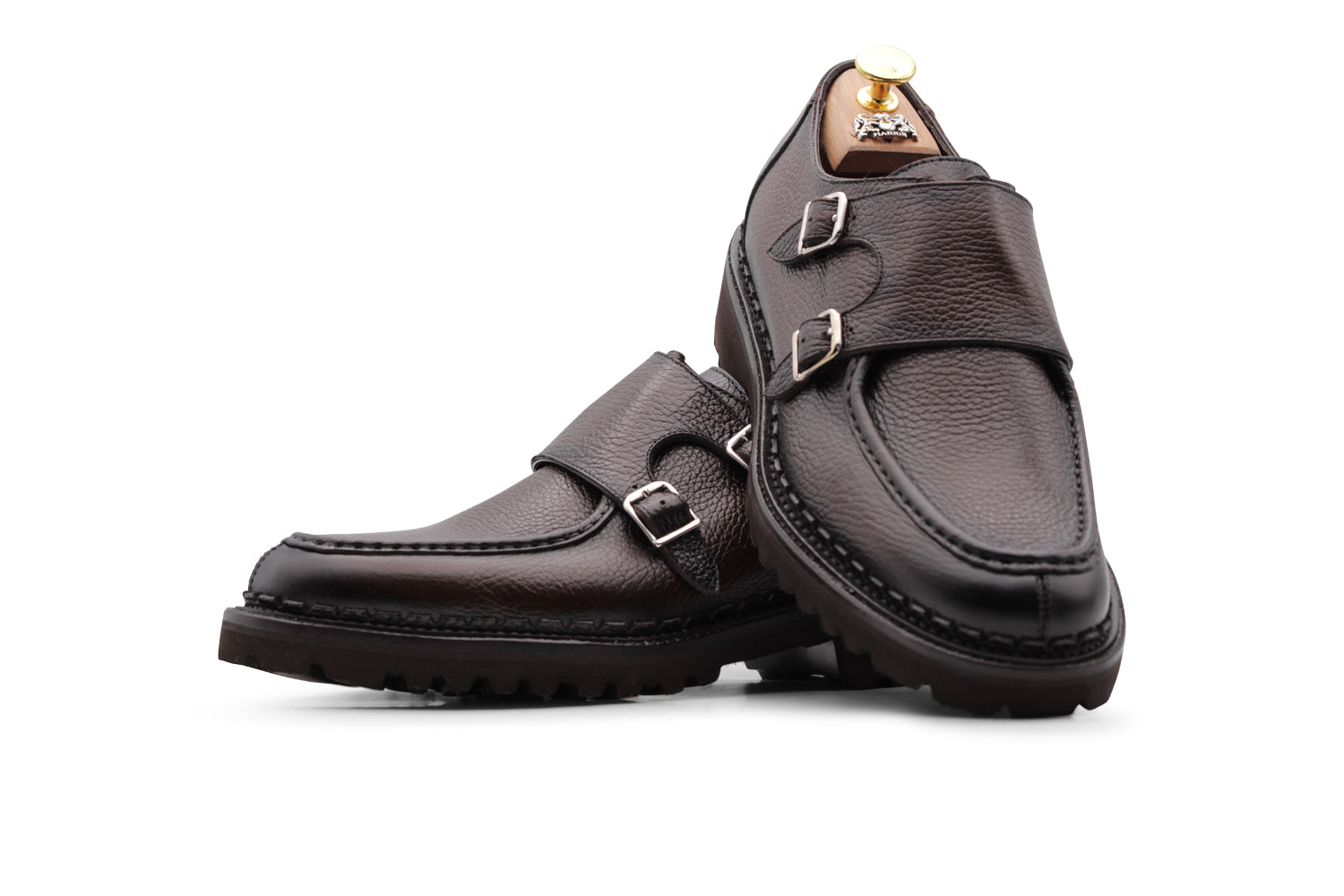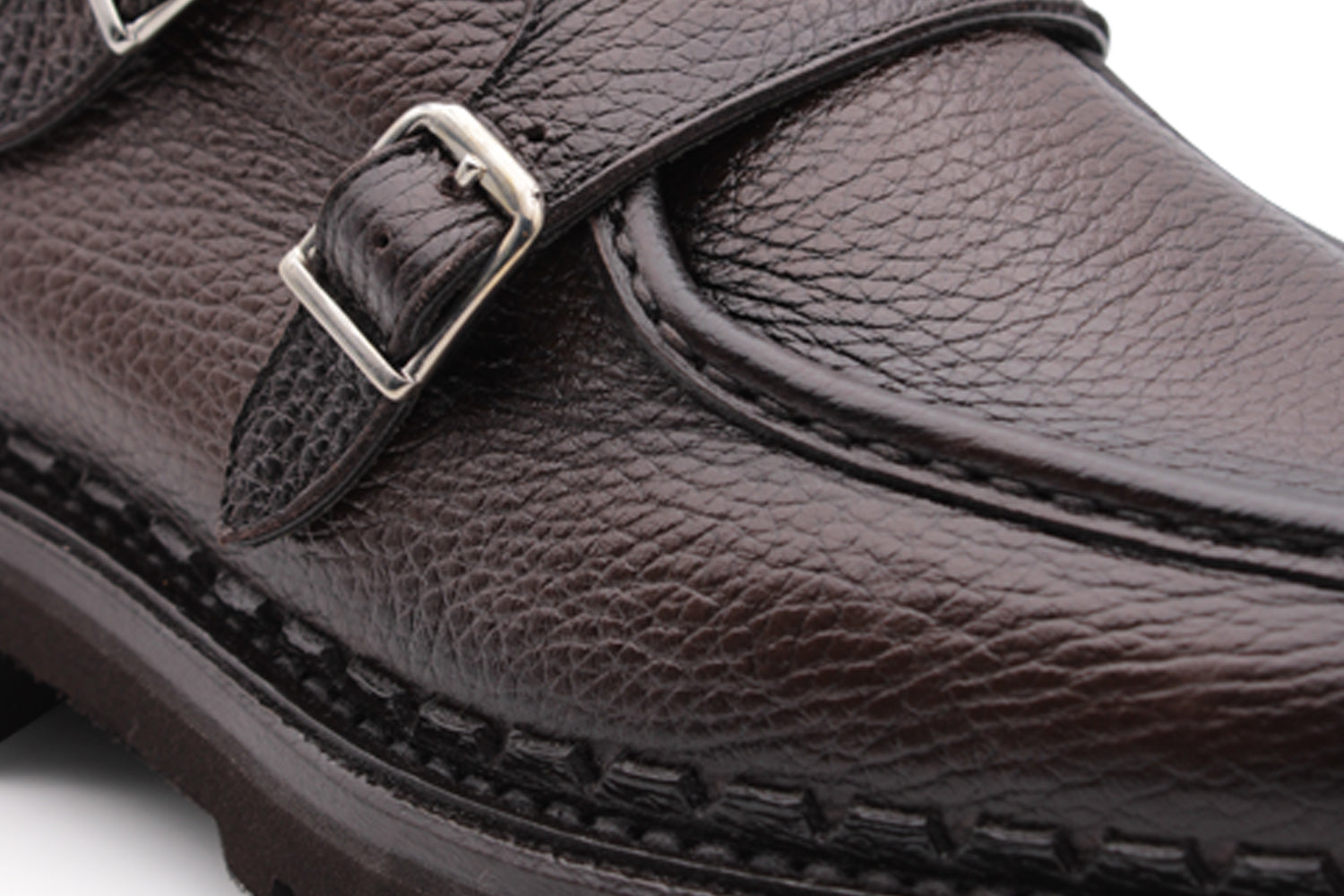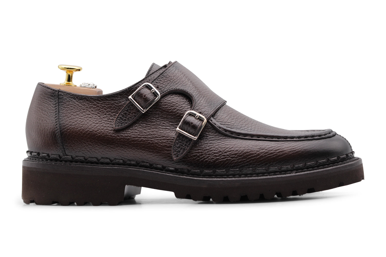 Doppia fibbia in vitello morbido stampato effetto alce, dipinta a mano con dettagli scuri. Le cuciture artigianali, la suola carrarmato e la lavorazione Blake Rapid conferiscono personalità e struttura.