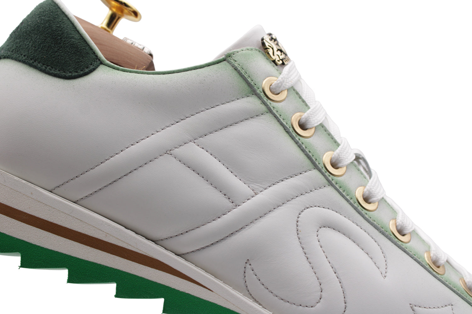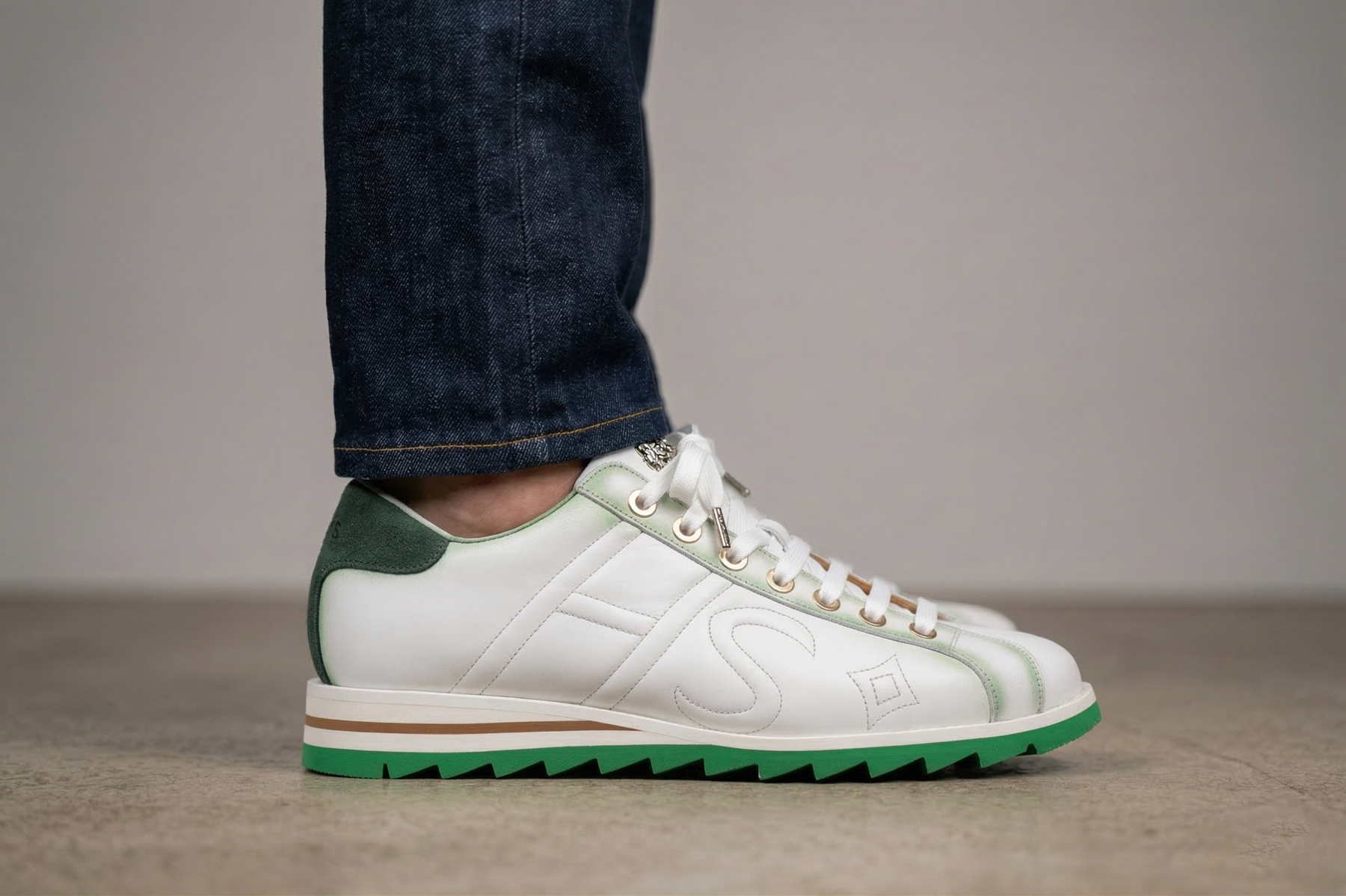 Dieser schlichte und raffinierte Schuh aus weißem, vollnarbigem Kalbsleder zeichnet sich durch seine grünen Wildlederdetails aus, die durch handwerkliche Verarbeitung schattiert sind. Die handschattierte Schnürung zeugt von viel Liebe zum Detail, abgerundet durch die Praktikabilität einer hochwertigen Laufsohle.