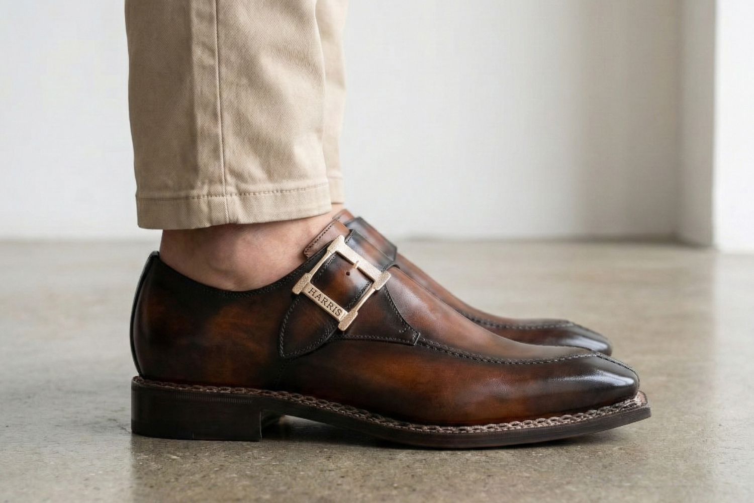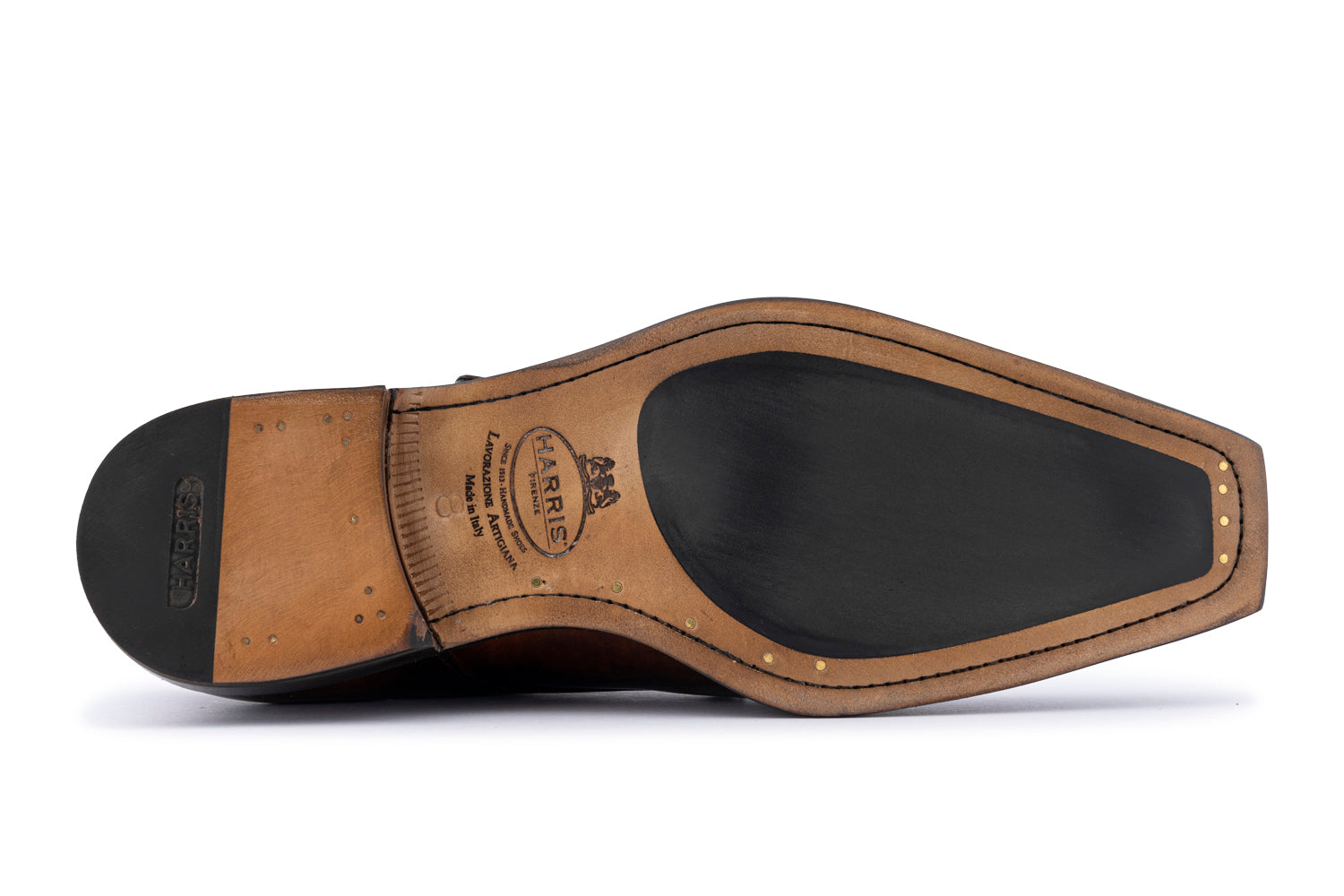 Die Essenz von Harris Shoes kommt in diesem Schuh aus vollnarbigem Kalbsleder zum Ausdruck. Die norwegische Verarbeitung, sichtbar in den typischen Flechtnähten, verleiht Stärke und einen unverwechselbaren Charakter. Jedes Paar ist für einen zeitlosen Look handbemalt in dunklen Farbtönen.