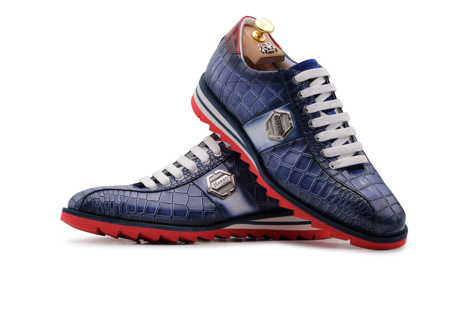 This sneaker combines premium crocodile-embossed brushed calfskin in a vibrant gradient light blue, illuminated by white detailing and a bold red leather heel. The runner sole ensures dynamic comfort, while the nickel accessories confirm the uniqueness of Harris.