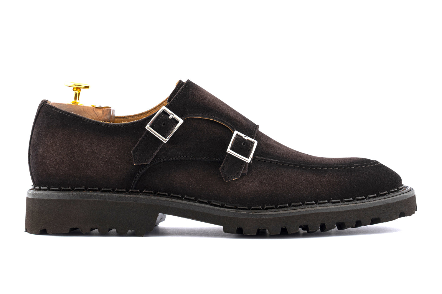 Un modèle qui allie élégance, solidité et personnalité authentique. Cette double boucle est réalisée en daim nuancé dans les tons marron, les coutures sur le bord soulignent le souci du détail tandis que la semelle crantée en caoutchouc avec trépointe surpiquée dans une teinte chaude jaune miel donne du caractère et une touche contemporaine.