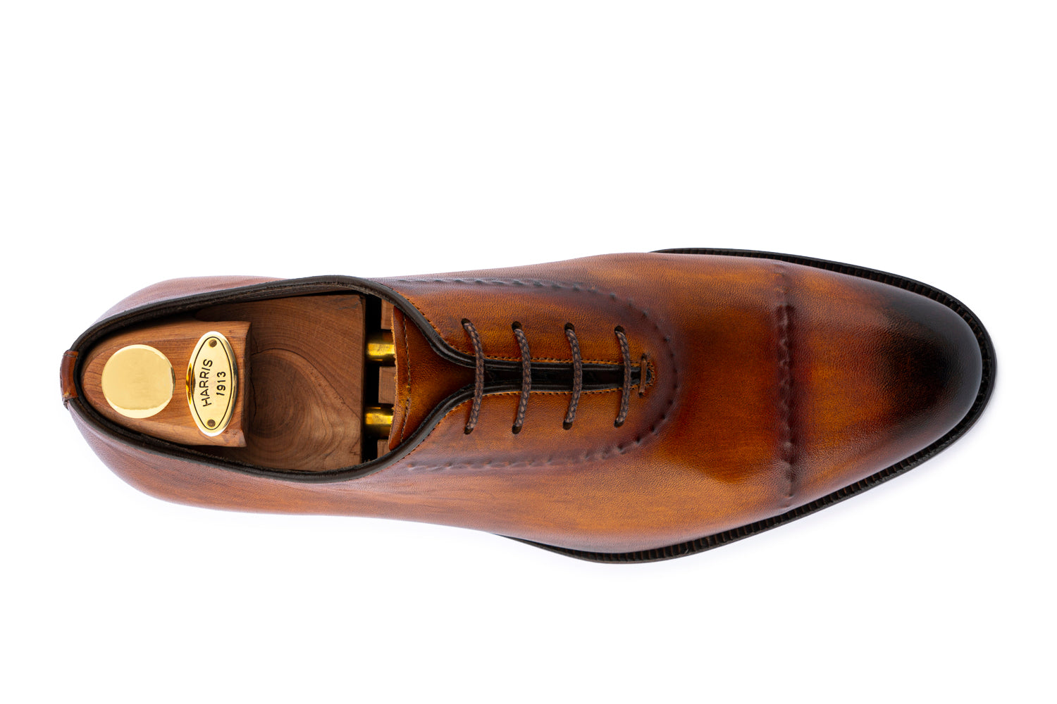 Francesina vitello pieno fiore con dettagli scuri e striature manuali. La particolarità delle cuciture "su carne" si unisce alla robustezza della suola in cuoio e alla pregiata costruzione Blake Rapid.