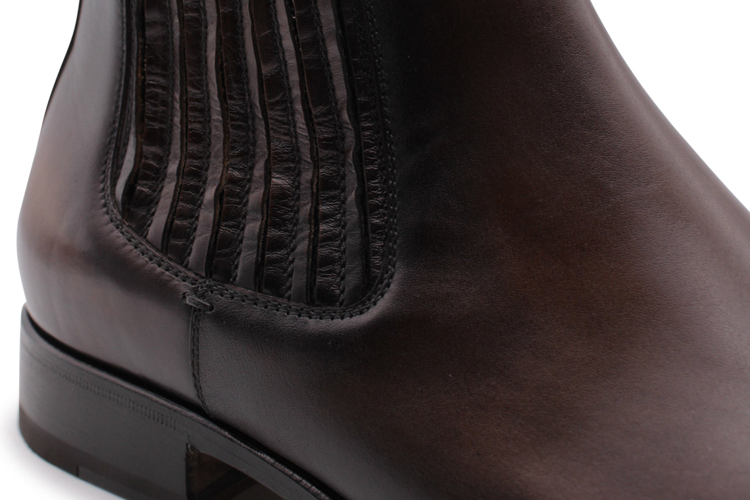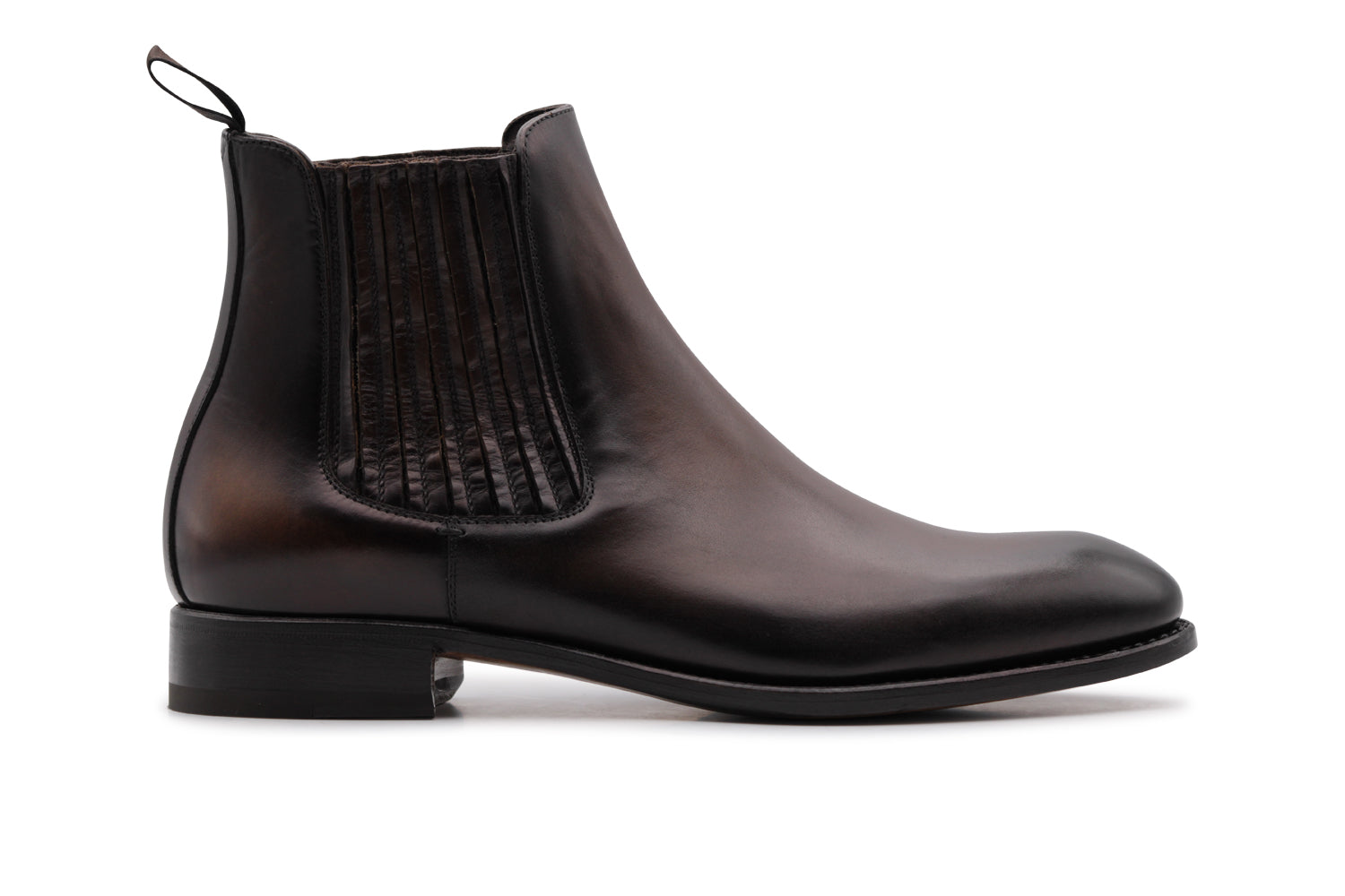 Polacchino realizzato in pelle di vitello liscia pieno fiore, dipinta a mano, che esprime l’eccellenza della tradizione artigianale italiana. L’elastico laterale fasciato in pelle assicura una calzata confortevole e un’estetica pulita ed essenziale mentre la suola in gomma, completata da guardolo cucito e lavorazione Blake Rapid, garantisce flessibilità, resistenza e comfort.