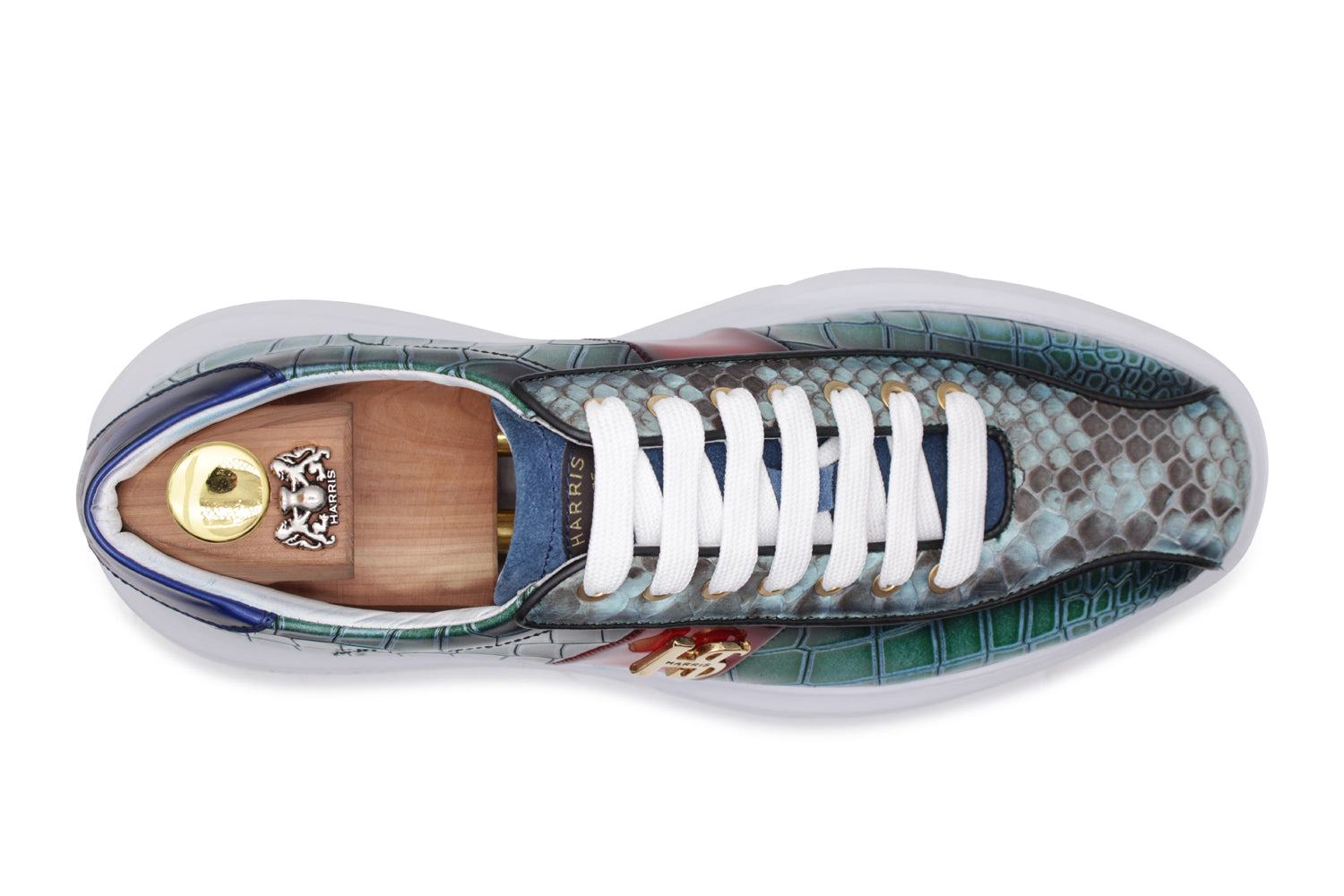 Questa sneakers in pelle spazzolata con stampa effetto coccodrillo è rifinita a mano per un aspetto unico e sofisticato. I dettagli in autentica pelle di pitone e gli accessori in finitura oro esaltano l’anima lussuosa del modello. Completa il design la suola in gomma a cassetta, simbolo di innovazione e comfort, per una sneaker che unisce carattere, artigianalità e stile distintivo.